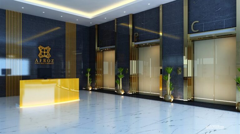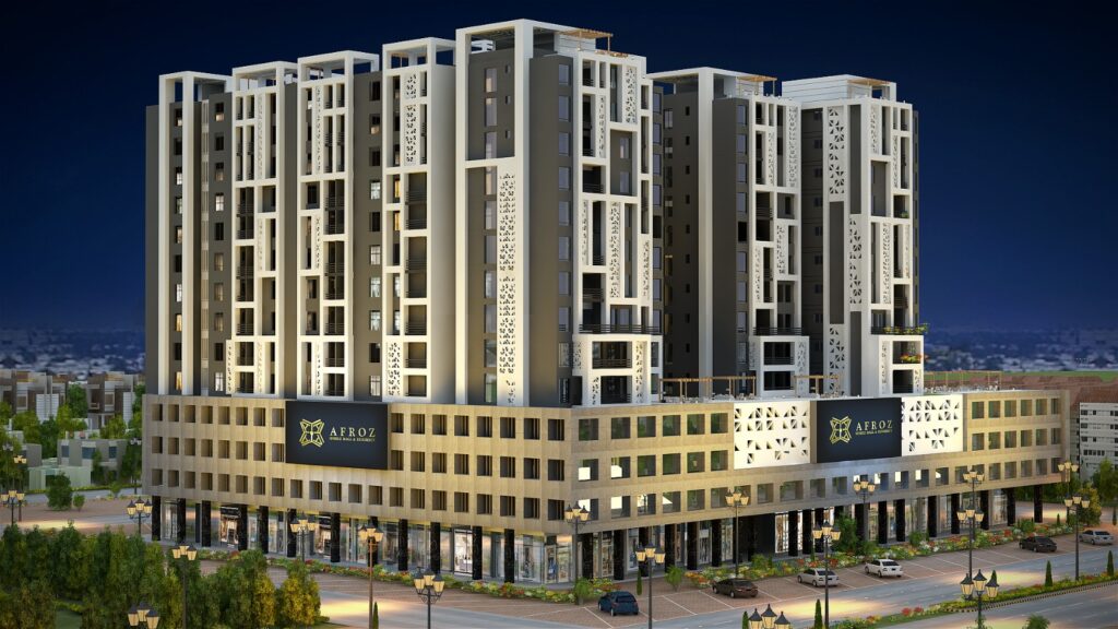 Afroz Mobile Mall and Residency stands tall as a modern destination in the busy heart of Korangi. Its sleek design and welcoming entrance create an impressive first look for visitors and residents alike. Blending vibrant commercial spaces with comfortable residential living, Afroz Mobile Mall and Residency offers a lifestyle where convenience meets contemporary style.