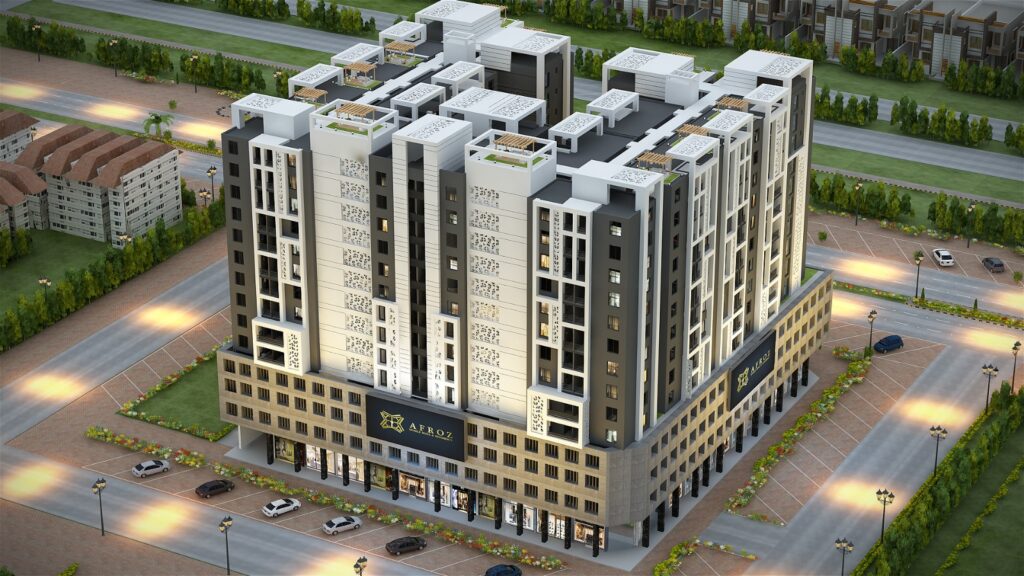 Afroz Mobile Mall and Residency Is Based On A Ground plus 15-floor building. You Can Choose From 3,4, And 5 Bedroom Configurations, Each With Private Balconies.
